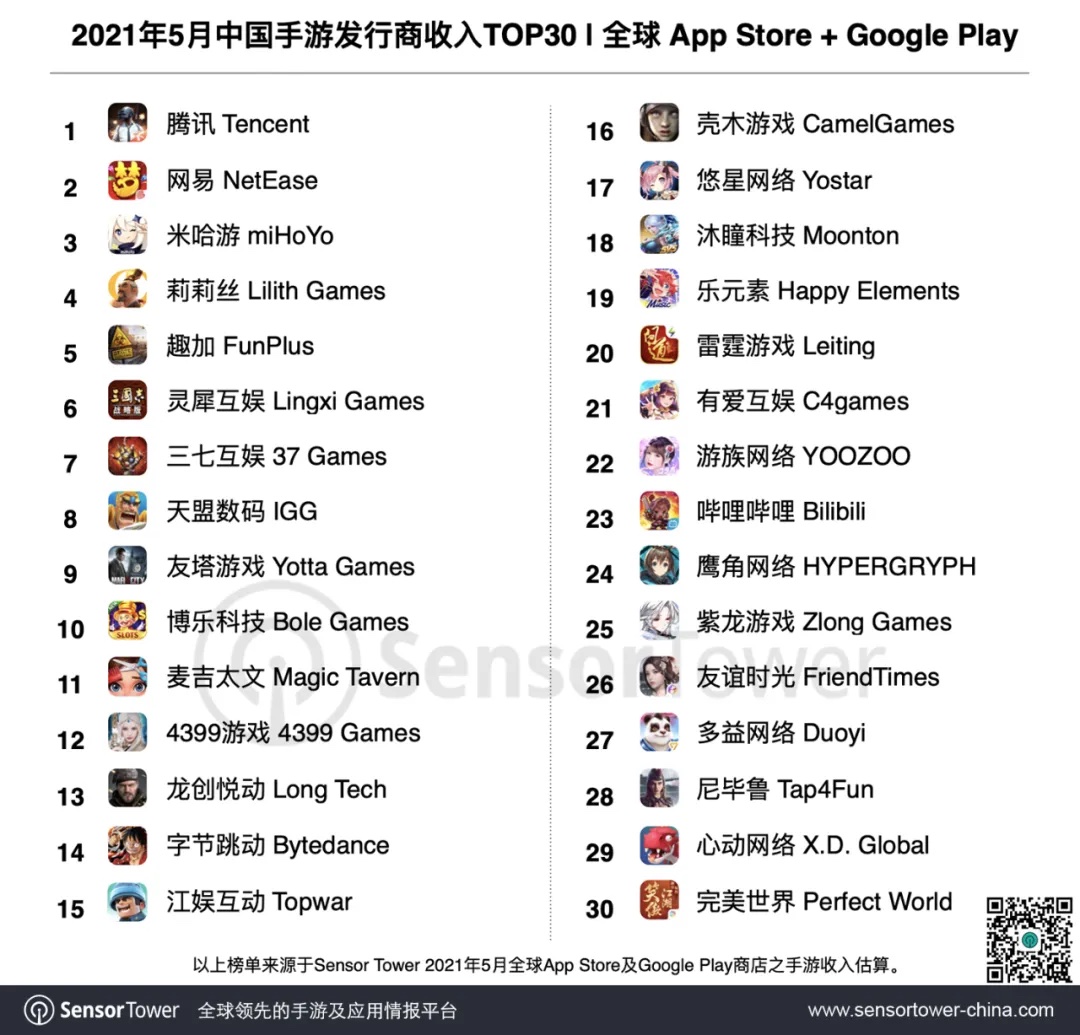 2021 年 5 月中国手游发行商全球收入排行榜:腾讯网易米哈游前三