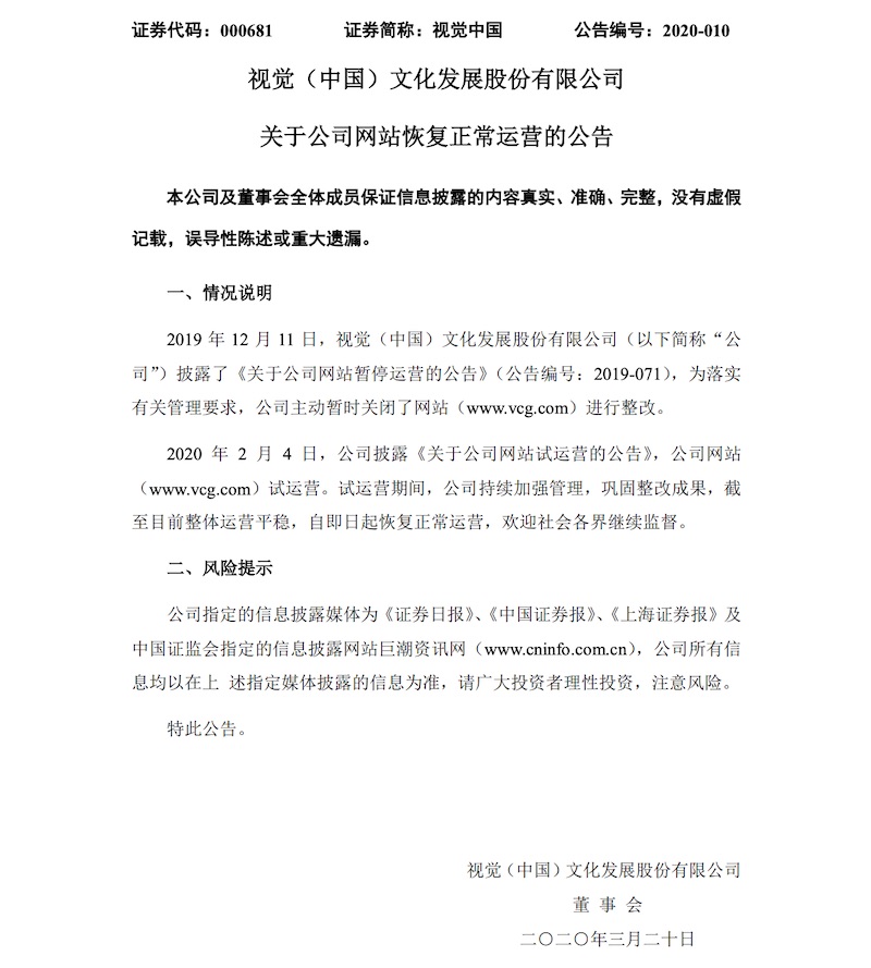 ,网站从头上线。2019 年 12 月,视觉我国发布公告称,执行有关办理要求,公司网站自即日起展开自查整改,整改期间
