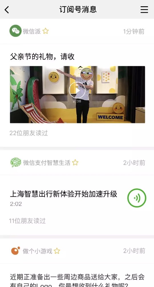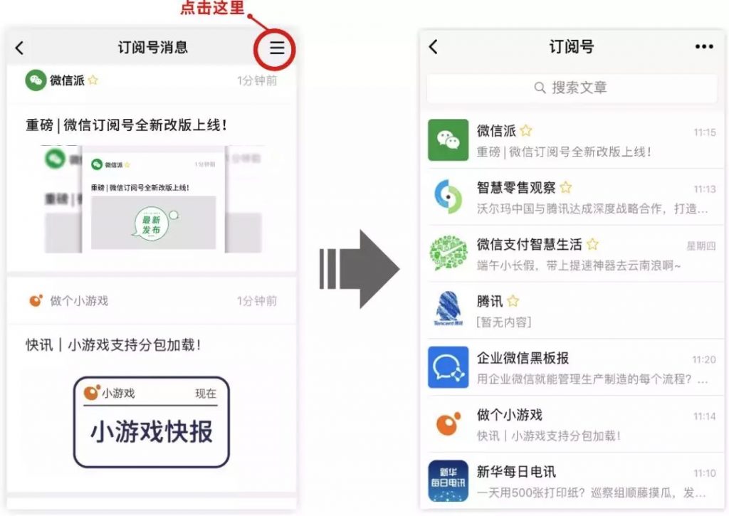,此举是为了优化用户阅览体会与功率,鼓舞订阅号内容的优化和创造。改版后,用户在微信主界面点击“订阅号音讯”将看到以时刻顺序排列的全新界面,内容以“标题+头图”的方式直接展现,一起支撑视频、语音、文字以及多条音讯的展现。用户点击右上方的汉堡菜单按钮就能看到了解的订阅号音讯列表了。
