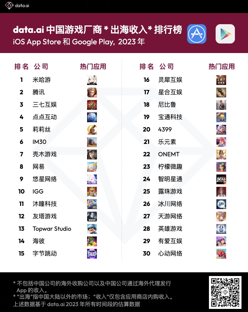 data.ai 2023 年中国游戏厂商及应用出海收入 30 强:共 27 家手游发行商海外营收破 1 亿美元