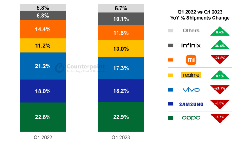 依据Counterpoint印度尼西亚智能手机月度追寻陈述,2022年第四季度购物季往后,印度尼西亚智能手机出货量在2023年第一季度同比下降7.6%。本季度出货量没有进一步下降,首要归功于3月正值斋月购物季出货量增加。这一下降首要受中高端智能手机出货量影响,2023年第一季度高端智能手机出货量同比下降25.8%。另一方面,入门级智能手机商场在2023年第一季度同比增加2.7%。