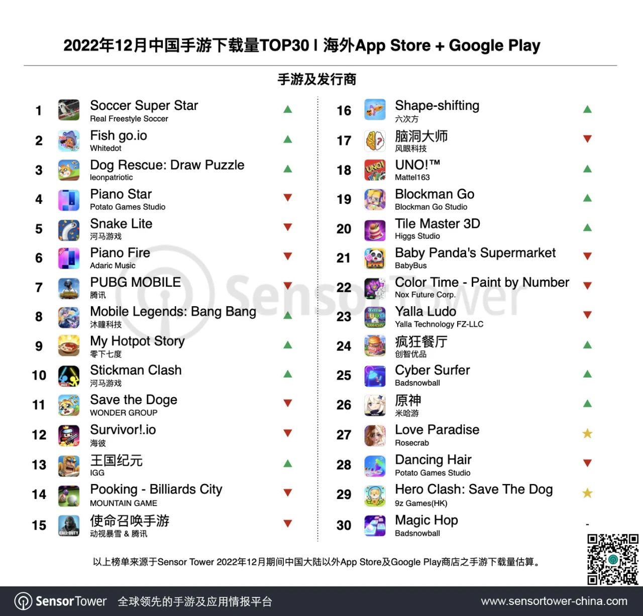 Sensor Tower 商铺情报渠道发布了 2022 年 12 月中国手游产品在海外商场收入及下载量排行榜,具体榜单改变如下。