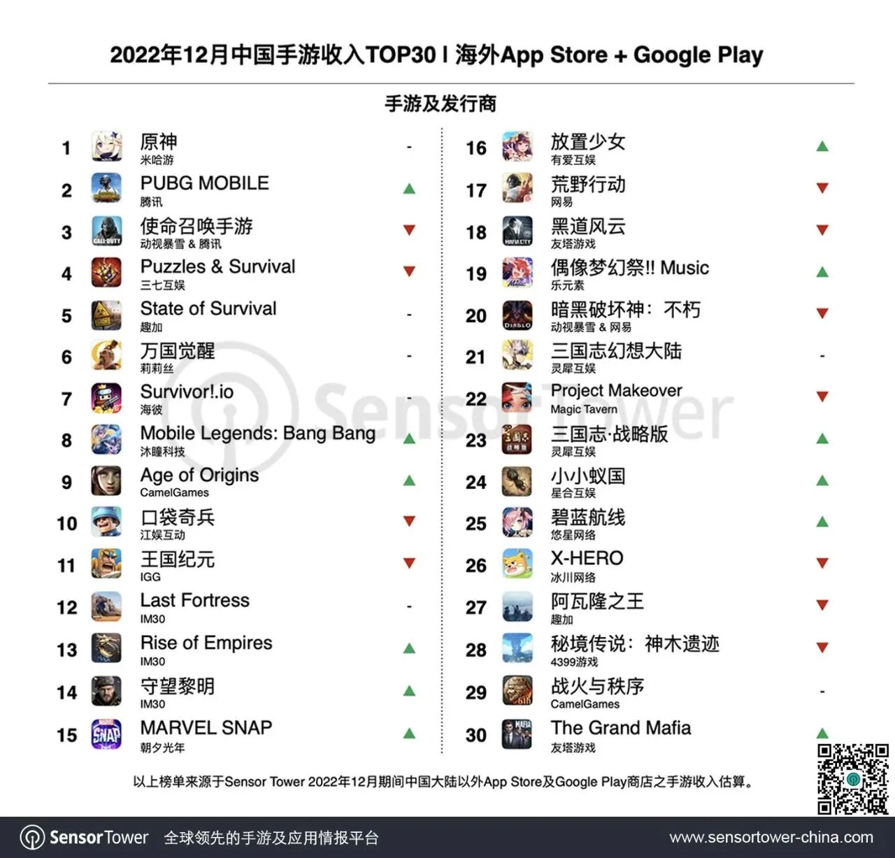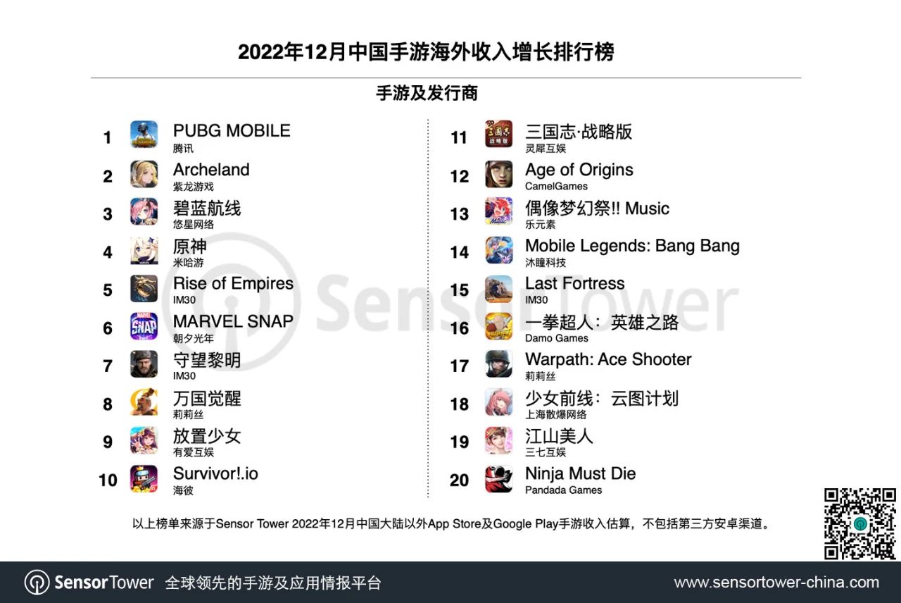 2022 年 12 月成功出海中国手游:《PUBG Mobile》登顶海外收入增长榜,多款策略手游收入表现亮眼